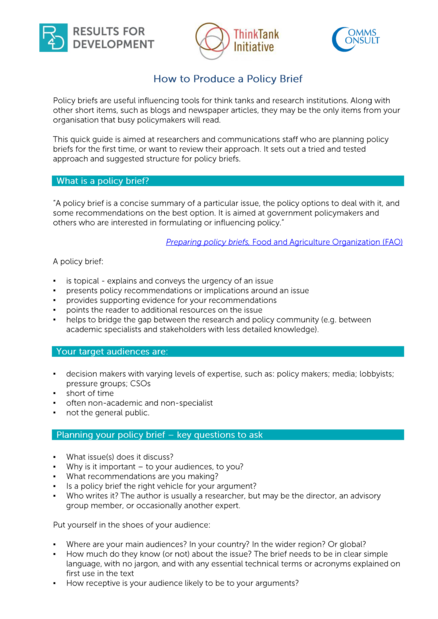 "Policy briefs are useful influencing tools for think tanks and research institutions. Along with other short items, such as blogs and newspaper articles, they may be the only items from your organisation that busy policymakers will read. This quick guide is aimed at researchers and communications staff who are planning policy briefs for the first time, or want to review their approach. It sets out a tried and tested approach and suggested sturcture for policy briefs." (Page 1)