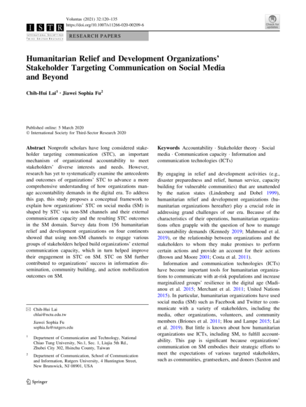 "Nonprofit scholars have long considered stakeholder targeting communication (STC), an important mechanism of organizational accountability to meet stakeholders’ diverse interests and needs. However, research has yet to systematically examine the antecedents and outcomes of organizations’ STC to advance a more comprehensive understanding of how organizations manage accountability demands in the digital era. To address this gap, this study proposes a conceptual framework to explain how organizations’ STC on social media (SM) is shaped by STC via non-SM channels and their external communication capacity and the resulting STC outcomes in the SM domain. Survey data from 156 humanitarian relief and development organizations on four continents showed that using non-SM channels to engage various groups of stakeholders helped build organizations’ external communication capacity, which in turn helped improve their engagement in STC on SM. STC on SM further contributed to organizations’ success in information dissemination, community building, and action mobilization outcomes on SM." (Abstract)