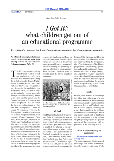 "An study among 1,564 children from Cambodia, Thailand, and the Philippines tested the increase of knowledge among viewers of the Southeast Asian programme "I Got It". Initiated by why the Goethe Institutes in Southeast Asia, this first regional knowledge programme for children was produced in 9 Asian countries (Brunei, Indonesia, Cambodia, Laos, Malaysia, Myanmar, the Philippines, Thailand, and Vietnam). According to the conclusion, "the study shows that children get something out of the programme. They get more out of some episodes than others, but the tendency is clear: knowledge programmes enrich children’s lives, especially if they provide new facts and insights, give visual form to things which are not usually visible, and thereby foster a more complex understanding of familiar things." (commbox)
