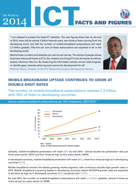 "The new figures show that, by the end of 2014, there will be almost 3 billion Internet users, two-thirds of them coming from the developing world, and that the number of mobile-broadband subscriptions will reach 2.3 billion globally. Fifty-five per cent of these subscriptions are expected to be in the developing world." (Page 1)