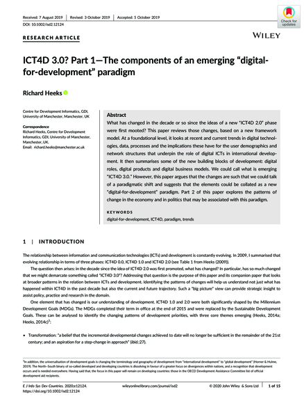 "What has changed in the decade or so since the ideas of a new “ICT4D 2.0” phase were first mooted? This paper reviews those changes, based on a new framework model. At a foundational level, it looks at recent and current trends in digital technologies, data, processes and the implications these have for the user demographics and network structures that underpin the role of digital ICTs in international development. It then summarises some of the new building blocks of development: digital roles, digital products and digital business models. We could call what is emerging “ICT4D 3.0.” However, this paper argues that the changes are such that we could talk of a paradigmatic shift and suggests that the elements could be collated as a new “digital-for-development” paradigm. Part 2 of this paper explores the patterns of change in the economy and in politics that may be associated with this paradigm." (Abstract)