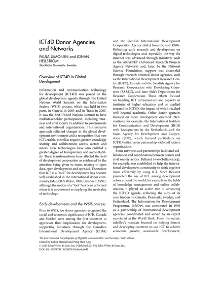 Overview of ICT4D in Global Development -- Early developments and the WSIS process -- Post-WSIS repositioning -- ICT4D: A complex field in development cooperation -- The mobile (r)evolution -- ICT4D research networks -- Multi-stakeholder partnerships -- From Hyperbole to Evidence Based Results -- Transparency, accountability, and participation -- The fragmentation-harmonization paradox -- WSIS+10 and the post-2015 development agenda