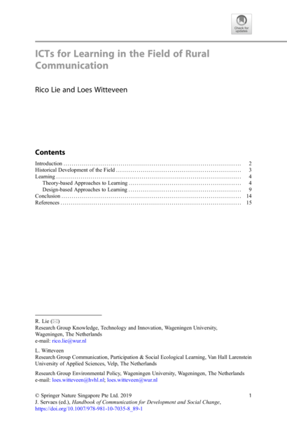 "This contribution surveys learning approaches in the field of agricultural extension, agricultural advisory services, and rural communication and explores their relationships with Information and Communication Technologies (ICTs). It makes a distinction between theory-based approaches to learning and design-based approaches to learning. The reviewed theory-based approaches are social learning, experiential learning, collaborative learning, and transformative learning and the design-based approaches are visual learning, intercultural learning, and distance learning. The choice for surveying these specific approaches is based on the relevance that these approaches have for the field of agricultural extension, agricultural advisory services, and rural communication. It is concluded that learning itself is to be seen as social and behavioral change and that the group is much valued in existing learning processes. Furthermore, experiences and reflections are central elements in all reviewed learning processes, and the visual and the cultural play crucial roles." (Abstract)