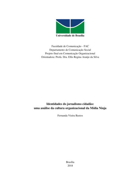 "O jornalismo cidadão é uma das principais formas de democratizar a comunicação. A pesquisa possui o objetivo de compreender a cultura organizacional de uma das grandes representantes desse tipo de jornalismo, a Mídia Ninja. Para isso, utilizou-se a metodologia triangular com a aplicação de questionários, realização de entrevistas e a observação participante nas sedes da Mídia Ninja Brasília e Mídia Ninja Belo Horizonte. O trabalho orientou-se pelo marco teórico das áreas de Jornalismo e Comunicação Organizacional e alcançou resultados que caracterizam o objeto de estudo: a colaboração como valor intrínseco da organização, a utilização das tecnologias para a comunicação interna, a mutação constante das equipes regionais, a solidariedade como moeda social e o modelo de funcionamento horizontal." (Resumo)
