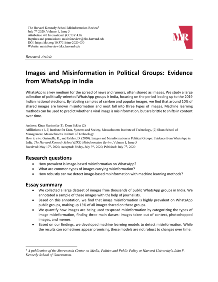 "WhatsApp is a key medium for the spread of news and rumors, often shared as images. We study a large collection of politically-oriented WhatsApp groups in India, focusing on the period leading up to the 2019 Indian national elections. By labeling samples of random and popular images, we find that around 10% of shared images are known misinformation and most fall into three types of images. Machine learning methods can be used to predict whether a viral image is misinformation, but are brittle to shifts in content over time." (Abstract)