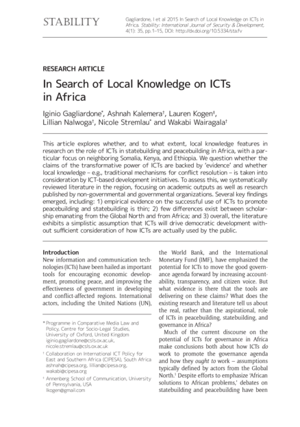 "This article explores whether, and to what extent, local knowledge features in research on the role of ICTs in statebuilding and peacebuilding in Africa, with a particular focus on neighboring Somalia, Kenya, and Ethiopia. We question whether the claims of the transformative power of ICTs are backed by ‘evidence’ and whether local knowledge – e.g., traditional mechanisms for conflict resolution – is taken into consideration by ICT-based development initiatives. To assess this, we systematically reviewed literature in the region, focusing on academic outputs as well as research published by non-governmental and governmental organizations. Several key findings emerged, including: 1) empirical evidence on the successful use of ICTs to promote peacebuilding and statebuilding is thin; 2) few differences exist between scholarship emanating from the Global North and from Africa; and 3) overall, the literature exhibits a simplistic assumption that ICTs will drive democratic development without sufficient consideration of how ICTs are actually used by the public." (Abstract)