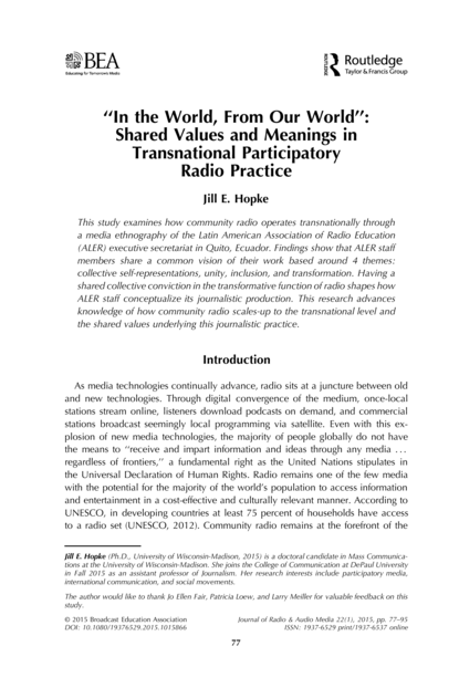 "This study examines how community radio operates transnationally through a media ethnography of the Latin American Association of Radio Education (ALER) executive secretariat in Quito, Ecuador. Findings show that ALER staff members share a common vision of their work based around 4 themes: collective self-representations, unity, inclusion, and transformation. Having a shared collective conviction in the transformative function of radio shapes how ALER staff conceptualize its journalistic production. This research advances knowledge of how community radio scales-up to the transnational level and the shared values underlying this journalistic practice." (Abstract)