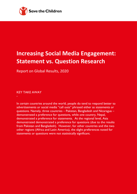"In certain countries around the world, people do tend to respond better to advertisements or social media “call outs” phrased either as statements or questions. Namely, three countries – Pakistan, Bangladesh and Nicaragua – demonstrated a preference for questions, while one country, Nepal, demonstrated a preference for statements. At the regional level, Asia demonstrated a preference for questions (due to the results from Pakistan and Bangladesh). However, for other countries and the two other regions (Africa and Latin America), the slight preferences noted for statements or questions were not statistically significant." (Key Take Away)