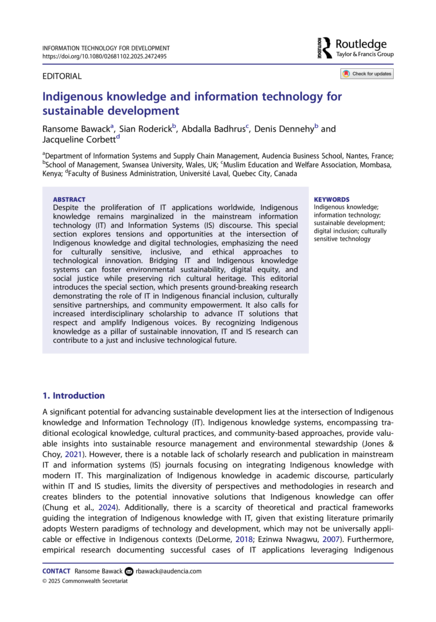 "Despite the proliferation of IT applications worldwide, Indigenous knowledge remains marginalized in the mainstream information technology (IT) and Information Systems (IS) discourse. This special section explores tensions and opportunities at the intersection of Indigenous knowledge and digital technologies, emphasizing the need for culturally sensitive, inclusive, and ethical approaches to technological innovation. Bridging IT and Indigenous knowledge systems can foster environmental sustainability, digital equity, and social justice while preserving rich cultural heritage. This editorial introduces the special section, which presents ground-breaking research demonstrating the role of IT in Indigenous financial inclusion, culturally sensitive partnerships, and community empowerment. It also calls for increased interdisciplinary scholarship to advance IT solutions that respect and amplify Indigenous voices. By recognizing Indigenous knowledge as a pillar of sustainable innovation, IT and IS research can contribute to a just and inclusive technological future." (Abstract)