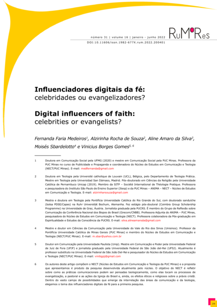 "Este trabalho apresenta uma reflexão inicial sobre o conceito de influenciadores digitais, considerando as perspectivas anteriores dos estudos de celebridades, com objetivo de propor novas dimensões para a análise desse fenômeno circunscrito no ambiente da fé. Buscando apreender os fenômenos socioeclesiais gerados a partirdos processos interacionais em rede, pretende-se discorrer sobre métodos capazes de ajudar a compreender os elementos teológicos e comunicacionais que compõem o campo específico dos influenciadores digitais da fé." (Resumen)