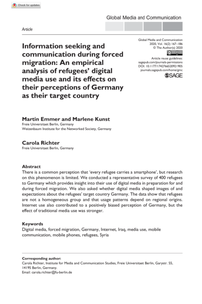 "There is a common perception that ‘every refugee carries a smartphone’, but research on this phenomenon is limited. We conducted a representative survey of 400 refugees to Germany which provides insight into their use of digital media in preparation for and during forced migration. We also asked whether digital media shaped images of and expectations about the refugees’ target country Germany. The data show that refugees are not a homogeneous group and that usage patterns depend on regional origins. Internet use also contributed to a positively biased perception of Germany, but the effect of traditional media use was stronger." (Abstract)