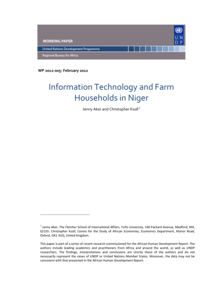 "This technical report seeks to understand the impact of improved access to information technology on farmers’ agricultural production and marketing practices in sub-Saharan Africa, with a specific focus on Niger. Related research suggests in that access to mobile telephony can reduce communication and search costs, thereby increasing rural households’ access to price and labor market information. Reducing information asymmetries should, in theory, allow households to better respond to shocks. We find that increased access to a mobile phone via an adult education program increases the diversity of crops planted, particularly marginal cash crops grown by women. This also increases the likelihood that these cash crops are grown, but does not increase the farm-gate price received." (Abstract)