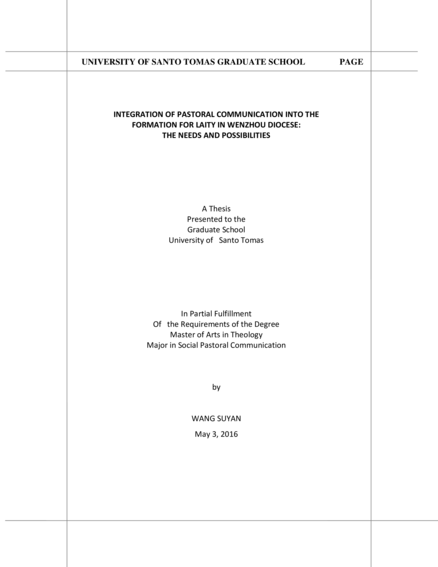"This study aims to examine the pastoral situations of Wenzhou Diocese, to evaluate the formation for laity in Wenzhou Diocese under pastoral communication perspective, to find its positive and critical signs, as well as to analyze the pastoral needs, which leads to integrate pastoral communication in lay formation. The survey result shows that “Xue Xi Ban” (Basic Ecclesial Community in Wenzhou context) helps laity in Wenzhou to know Catholic faith, to live as Christian, to have sense of belonging, and to exercise their vocation and mission. The lack of Catechists, the study content, need for community building, and missing structural support, are the critical signs of “Xue Xi Ban”, which indicates the pastoral needs for lay formation. These needs are categorized as the need of strengthening pastoral communication in ministry (Preaching, Catechesis, Liturgy, Biblical Apostolate, and Service), the need of formation for catechists, and the need of means of social communication. This study also finds out seven challenges for lay formation: the Atheistic approach, the political pressure, the threat of Materialism, the impact of migration, the family problem, the division among the Catholic Church, and lack witness of life. The pastoral needs and challenges demand an emphasis on pastoral communication. By using the “Wenzhou Model of development”, the research explores the possibilities of integrating pastoral communication in lay formation, which includes to make a five-year pastoral plan, to promote Basic Ecclesial Community, to use possible agents for lay formation, and to create possible programs for lay formation." (Abstract)