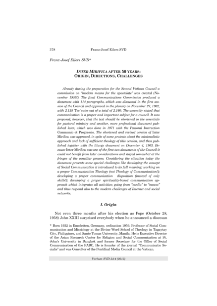 "Already during the preparation for the Second Vatican Council a commission on “modern means for the apostolate” was created (November 1959!). The final Communications Commission produced a document with 114 paragraphs, which was discussed in the first session of the Council and approved in the plenary on November 27, 1962, with 2.138 ‘Yes’ votes out of a total of 2.160. The assembly stated that communication is a proper and important subject for a council. It was proposed, however, that the text should be shortened to the essentials for pastoral ministry and another, more professional document published later, which was done in 1971 with the Pastoral Instruction Communio et Progressio. The shortened and revised version of Inter Mirifica was approved, in spite of some protests about the minimalistic approach and lack of sufficient theology of this version, and then published together with the liturgy document on December 4,1963. Because Inter Mirifica was one of the first two documents of the Council it could not benefit from later considerations and stayed somewhat at the fringes of the conciliar process. Considering the situation today the document presents some special challenges like developing the concept of Social Communication it introduced to its full meaning; working on a proper Communication Theology (not Theology of Communication!); developing a proper communication disposition (instead of only skills!); developing a proper spirituality-based communication approach which integrates all activities; going from “media” to “means” and thus respond also to the modern challenges of Internet and social networks." (Abstract)