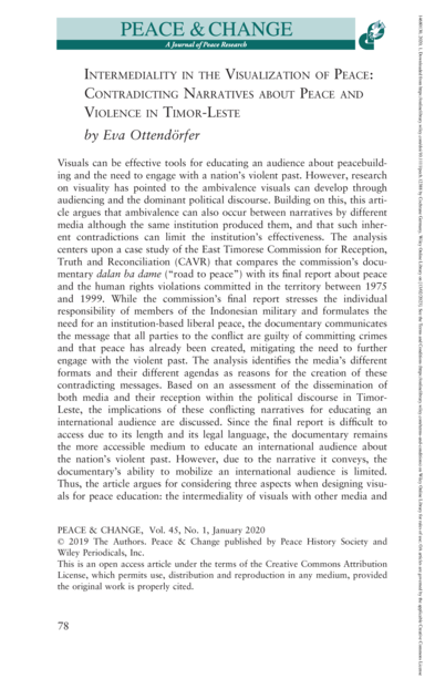 "The documentary dalan ba dame was produced by the East Timorese Commission for Reception, Truth and Reconciliation (Comissao de Acolhimento, Verdade e Reconciliaao de Timor-Leste, CAVR) and covers the twenty-four years of Indonesian occupation of Timor-Leste, during which nearly one quarter of the population died. The CAVR was originally set up to produce a report about the human rights violations committed between April 25, 1975, and October 25, 1999, analyze its root causes, and identify ways of how to come to terms with the violent past. It therefore constitutes an instrument of transitional justice, defined as “a set of practices, mechanisms, and concerns that arise following a period of conflict, civil strife, or repression and that are aimed directly at confronting and dealing with past violations of human rights and humanitarian law.”1 As the same institution produced both media, the report about the human rights violations and the documentary, one should expect them to communicate the same message. However, this is not the case. The report emphasizes the need to prosecute individual members of the Indonesian military for the human rights violations committed as a precondition for sustainable peace. The documentary tells the story that peace already prevails and keeping it is a matter of reconciliation among the East Timorese population. Consequently, the case of the CAVR and its documentary is interesting for research on visuality, which analyzes the dynamics and effects of visuals in social and political processes." (Introduction)