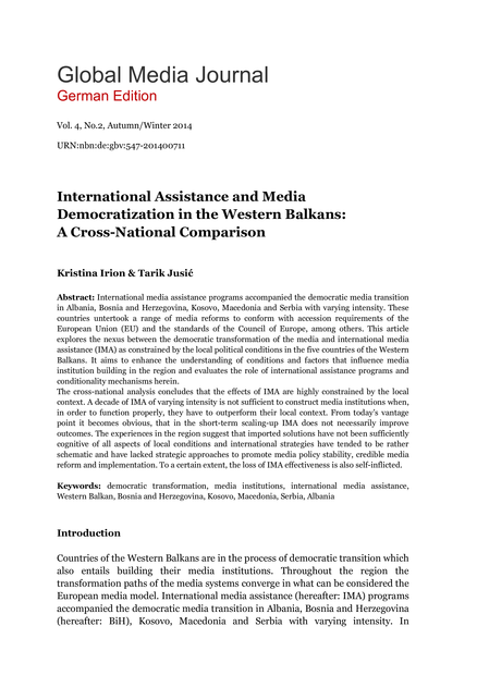 "This article explores the nexus between the democratic transformation of the media and international media assistance (IMA) as constrained by the local political conditions in the five countries of the Western Balkans. It aims to enhance the understanding of conditions and factors that influence media institution building in the region and evaluates the role of international assistance programs and conditionality mechanisms herein. The cross-national analysis concludes that the effects of IMA are highly constrained by the local context. A decade of IMA of varying intensity is not sufficient to construct media institutions when, in order to function properly, they have to outperform their local context. From today’s vantage point it becomes obvious, that in the short-term scaling-up IMA does not necessarily improve outcomes. The experiences in the region suggest that imported solutions have not been sufficiently cognitive of all aspects of local conditions and international strategies have tended to be rather schematic and have lacked strategic approaches to promote media policy stability, credible media reform and implementation." (Abstract)