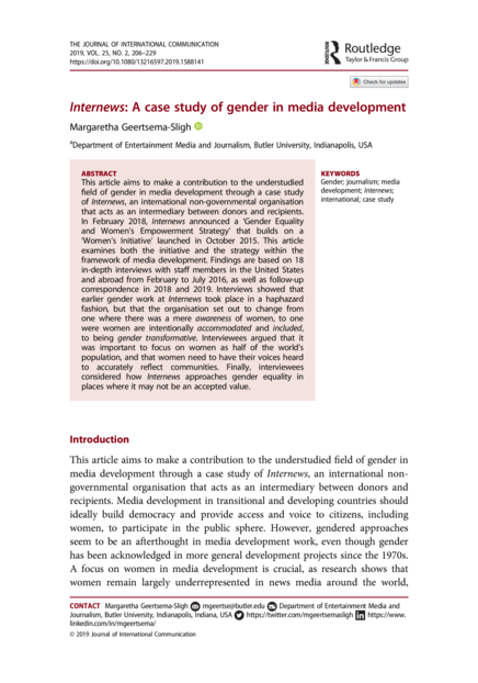 "This article aims to make a contribution to the understudied field of gender in media development through a case study of Internews, an international non-governmental organisation that acts as an intermediary between donors and recipients. In February 2018, Internews announced a ‘Gender Equality and Women’s Empowerment Strategy’ that builds on a ‘Women’s Initiative’ launched in October 2015. This article examines both the initiative and the strategy within the framework of media development. Findings are based on 18 in-depth interviews with staff members in the United States and abroad from February to July 2016, as well as follow-up correspondence in 2018 and 2019. Interviews showed that earlier gender work at Internews took place in a haphazard fashion, but that the organisation set out to change from one where there was a mere awareness of women, to one were women are intentionally accommodated and included, to being gender transformative. Interviewees argued that it was important to focus on women as half of the world’s population, and that women need to have their voices heard to accurately reflect communities. Finally, interviewees considered how Internews approaches gender equality in places where it may not be an accepted value." (Abstract)