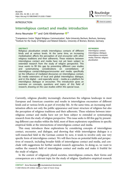 "Religious pluralisation entails interreligious contacts of different kinds and at various levels. At the same time, an increasing mediatisation affects the perception of and encounter with other religious traditions and their adherents. These relations between interreligious contact and media have not yet been subject to extended research from the study of religion perspective. This issue wants to fill this gap by presenting different case studies and systematising considerations on constellations of interreligious contact/dialogue/encounter and media: specifically (a) the influence of mediated discourses on interreligious contact, (b) media extensions of local and global interreligious dialogue, and (c) the digital – and especially social – media as a platform for interreligious dialogue or encounter. This introduction gives an overview on concepts, questions and topics of this field of research, drawing on the case studies within this special issue." (Abstract)