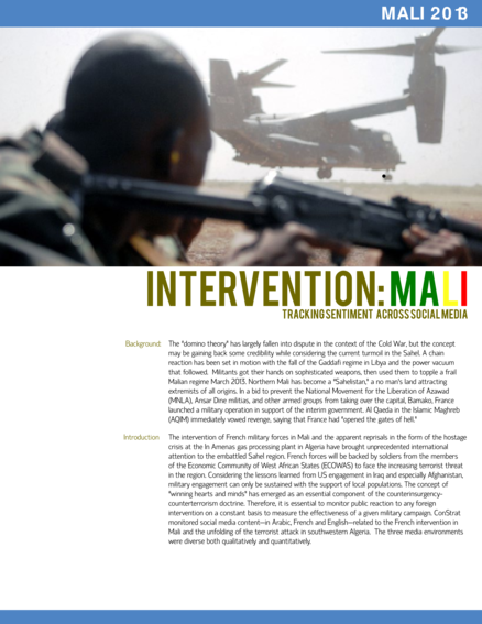 "Considering the lessons learned from US engagement in Iraq and especially Afghanistan, military engagement can only be sustained with the support of local populations. The concept of “winning hearts and minds” has emerged as an essential component of the counterinsurgency-counterterrorism doctrine. Therefore, it is essential to monitor public reaction to any foreign intervention on a constant basis to measure the effectiveness of a given military campaign. ConStrat monitored social media content—in Arabic, French and English—related to the French intervention in Mali and the unfolding of the terrorist attack in southwestern Algeria. The three media environments were diverse both qualitatively and quantitatively." (Introduction)