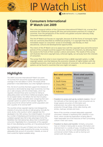 "This is the inaugural edition of the Consumers International IP Watch List, a survey that examines the intellectual property (IP) laws and enforcement practices of a range of countries, from the perspective of the world's only global consumer advocacy body, Consumers International (CI). This first IP Watch List focuses on copyright, because of all the forms of monopoly rights that are commonly described as intellectual property, it is copyright that has the most immediate impact on consumers' access to knowledge, and thereby on their educational, cultural and developmental opportunities. The intent of this IP Watch List is to assess how well the copyright laws and enforcement policies of the surveyed countries support the interests of consumers, by allowing them fair access to the fruits of their society's culture and science. The results of this survey will illustrate that strict copyright laws, enforced rigidly, can seriously harm the interests of consumers. The survey finds that what is more important than a strict copyright system, is a fair copyright system; one that balances the economic interests of rights holders with the compelling economic, social and cultural interests of consumers. As will be seen, such systems can be found in countries that one might not expect." (Page 1)