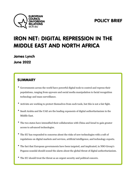 "Saudi Arabia and the UAE are the leading exponents of digital authoritarianism in the Middle East. The two states have intensified their collaboration with China and Israel to gain greater access to advanced technologies. The EU has responded to concerns about the risks of new technologies with a raft of regulations on digital markets and services, artificial intelligence, and technology exports. The fact that European governments have been targeted, and implicated, in NSO Group’s Pegasus scandal should sound the alarm about the global threat of digital authoritarianism. The EU should treat the threat as an urgent security and political concern." (Summary)