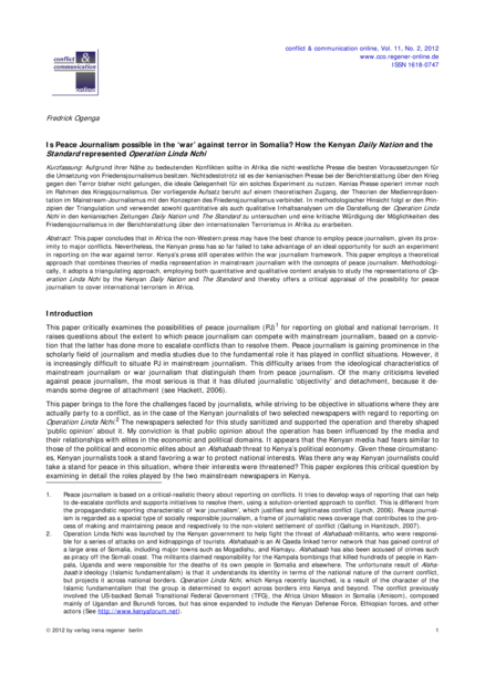 "This paper concludes that in Africa the non-Western press may have the best chance to employ peace journalism, given its proximity to major conflicts. Nevertheless, the Kenyan press has so far failed to take advantage of an ideal opportunity for such an experiment in reporting on the war against terror. Kenya's press still operates within the war journalism framework. This paper employs a theoretical approach that combines theories of media representation in mainstream journalism with the concepts of peace journalism. Methodologically, it adopts a triangulating approach, employing both quantitative and qualitative content analysis to study the representations of Operation Linda Nchi by the Kenyan Daily Nation and The Standard and thereby offers a critical appraisal of the possibility for peace journalism to cover international terrorism in Africa." (Abstract)