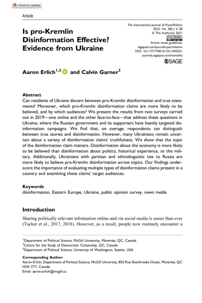 "Can residents of Ukraine discern between pro-Kremlin disinformation and true statements? Moreover, which pro-Kremlin disinformation claims are more likely to be believed, and by which audiences? We present the results from two surveys carried out in 2019—one online and the other face-to-face—that address these questions in Ukraine, where the Russian government and its supporters have heavily targeted disinformation campaigns. We find that, on average, respondents can distinguish between true stories and disinformation. However, many Ukrainians remain uncertain about a variety of disinformation claims’ truthfulness. We show that the topic of the disinformation claim matters. Disinformation about the economy is more likely to be believed than disinformation about politics, historical experience, or the military. Additionally, Ukrainians with partisan and ethnolinguistic ties to Russia are more likely to believe pro-Kremlin disinformation across topics. Our findings underscore the importance of evaluating multiple types of disinformation claims present in a country and examining these claims’ target audiences." (Abstract)