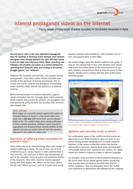 Platforms like Facebook and YouTube, very popular among young people, make these videos widely accessible even outside of the spectrum of Islamist movements. This in-creases the risk for children and youngsters of stumbling across Islamist's ideas, hatred and depictions of extreme violence. [...] Many videos rely on an emotionalizing effect with images of children suffering or dying. The use of close-ups of faces contorted by pain, serious injuries or even severed limbs is very common. The producers of these clips emotionally ap-peal to the empathy, sense of justice and protective instinct of the recipients. Very often, Islamists directly approach young men with slogans like 'Where are the lions? Where are the men? Where are you?' and try to make more young Muslims shoulder responsibility for 'their brothers and sis-ters' and support them in their fight.