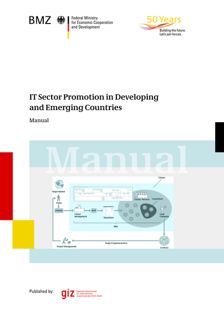 "The manual and the toolbox seek to address the following question: how to maximise the contribution of the IT industry in developing and emerging countries towards sustainable economic development and poverty reduction? In order to achieve this, the Manual analyses the obstacles impeding the competitive development of this innovative industry in developing and emerging countries. They can be attributed to three major factors: Specific structural problems of developing countries such as lack of efficient support structures, deficiencies in managerial, financial and technological skills, negative brand and country of origin effects (image); Challenges related to internationalisation and export, such as lack of market intelligence and export capabilities as well as the absence of international linkage; Specifics of the IT industry including technical as well as quality standards, high competitive pressure and short innovation cycles. The manual and the toolbox introduce a methodology and a set of practical tools to address these obstacles and promote the IT industry in developing and emerging countries. Their purpose is to provide a practical guideline for designing and implementing projects for promoting the IT sector in developing and emerging countries; develop a specific methodology to enable effective and sustainable IT sector promotion based on the practical experience of German development cooperation; elaborate concrete procedures, processes and tools to promote the IT industry in developing and emerging countries; provide advice on actions and measures to improve the international competitiveness of IT sectors; provide best practices of IT sector promotion in developing and emerging countries." (Executive summary, page 6)