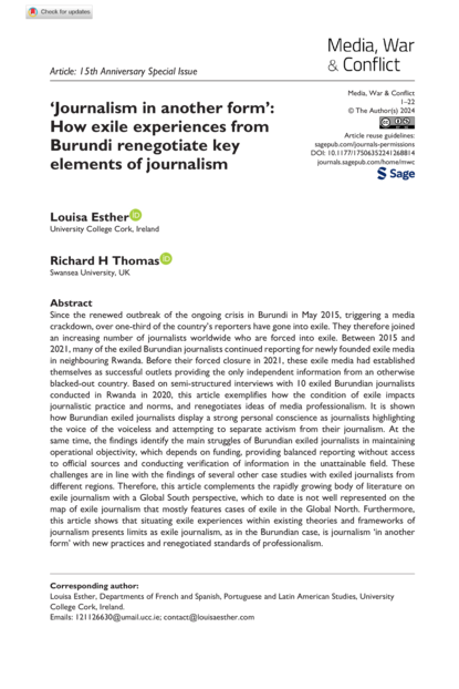 "Since the renewed outbreak of the ongoing crisis in Burundi in May 2015, triggering a media crackdown, over one-third of the country’s reporters have gone into exile. They therefore joined an increasing number of journalists worldwide who are forced into exile. Between 2015 and 2021, many of the exiled Burundian journalists continued reporting for newly founded exile media in neighbouring Rwanda. Before their forced closure in 2021, these exile media had established themselves as successful outlets providing the only independent information from an otherwise blacked-out country. Based on semi-structured interviews with 10 exiled Burundian journalists conducted in Rwanda in 2020, this article exemplifies how the condition of exile impacts journalistic practice and norms, and renegotiates ideas of media professionalism. It is shown how Burundian exiled journalists display a strong personal conscience as journalists highlighting the voice of the voiceless and attempting to separate activism from their journalism. At the same time, the findings identify the main struggles of Burundian exiled journalists in maintaining operational objectivity, which depends on funding, providing balanced reporting without access to official sources and conducting verification of information in the unattainable field. These challenges are in line with the findings of several other case studies with exiled journalists from different regions. Therefore, this article complements the rapidly growing body of literature on exile journalism with a Global South perspective, which to date is not well represented on the map of exile journalism that mostly features cases of exile in the Global North. Furthermore, this article shows that situating exile experiences within existing theories and frameworks of journalism presents limits as exile journalism, as in the Burundian case, is journalism ‘in another form’ with new practices and renegotiated standards of professionalism." (Abstract)