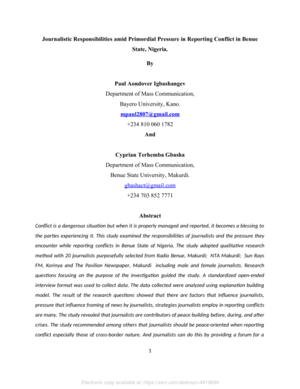 "Conflict is a dangerous situation but when it is properly managed and reported, it becomes a blessing to the parties experiencing it. This study examined the responsibilities of journalists and the pressure they encounter while reporting conflicts in Benue State of Nigeria. The study adopted a qualitative research method with 20 journalists purposefully selected from Radio Benue, Makurdi; NTA Makurdi; Sun Rays FM, Korinya and The Pavilion Newspaper, Makurdi including male and female journalists. Research questions focusing on the purpose of the investigation guided the study. A standardized open-ended interview format was used to collect data. The data collected were analyzed using an explanation building model. The result of the research questions showed that there are factors that influence journalists, pressure that influence framing of news by journalists, strategies journalists employ in reporting conflicts are many. The study revealed that journalists are contributors of peace building before, during, and after crises. The study recommended among others that journalists should be peace-oriented when reporting conflict, especially those of cross-border nature. And journalists can do this by providing a forum for a critical analysis of issues in a conflict through incisive, informed and critical comments from editorialists, columnists, opinion and feature writers among others so as to open up the space for discussion from all fronts which would enlighten the reading public and possibly, the official negotiators in a conflict." (Abstract)