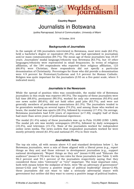 "The top six roles, all with means above 4.5 and standard deviations below 1, for Botswana journalists, were a mix of those aligned with a liberal press (e.g., report things as they are) and those relevant to development journalism (e.g., support national development). “Report things as they are” (mean=4.80) and “Educate the audience” (mean=4.70) were the top two roles for these journalists (see Table 1) with 96.2 percent and 94.1 percent of the journalists respectively saying that they considered these roles “extremely” or “very” important. The least important roles, both with means below the midpoint of three, were “Be an adversary of government” (mean=2.62) and “Convey a positive image of political leadership” (mean=2.40); these journalists did not want to take a seriously adversarial stance with government but neither did they want to convey a positive image of political leaders." (Journalistic roles, page 1)