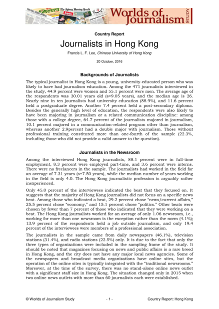"Hong Kong journalists treated as most important the roles of monitoring and scrutinizing political leaders, reporting things as they are, monitoring and scrutinizing businesses, providing analysis of current affairs, and letting people express their views. Given the emphasis on monitoring the power holders, “to be a detached observer” was treated as important only by slightly more than half of the respondents. Twelve of the 18 roles included in the questionnaire were treated as important by fewer than half of the respondents. About one-third saw the advocacy role of the press as important, and about three in ten saw setting the political agenda and motivating people to participate in politics as important. The Hong Kong journalists were least likely to see conveying a positive image of political leadership, supporting government policy, providing entertainment and relaxation, and supporting national development as important roles. However, the percentage of journalists seeing the press as an adversary of the government is also low (14.4%). It indicates that the Hong Kong journalists saw themselves as an independent watchdog without being an adversary to the power holders." (Journalistic roles, page 2)