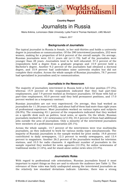 "With regard to professional role orientations, Russian journalists found it most important to report things as they are and to educate the audience. The relevance of these roles was fairly undisputed among the interviewed journalists as the relatively low standard deviations indicate. Likewise, there was a strong consensus among the respondents over the little importance of supporting government policy and conveying a positive image of political leadership. Still, a majority of journalists in Russia found it important to provide advice, orientation and direction for daily life, to advocate for social change, to provide the kind of news that attracts the largest audience, to provide analysis of current affairs, to tell stories about the world, to be a detached observer, to let people express their views, to promote tolerance and cultural diversity, and to support national development. Politically more assertive roles, on the other hand, were supported by only a minority of respondents. Following traits belong to these roles: influencing public opinion, setting the political agenda, and acting as adversary of the government." (Journalistic roles, pages 1-2)