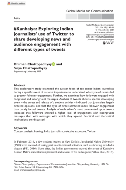 #Kanhaiya: Exploring Indian Journalists’ Use of Twitter to Share Developing News and Audience Engagement with Different Types of Tweets