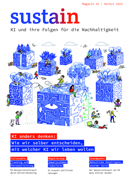 "KI verschlingt viele Ressourcen und hat oft negative Folgen für unsere Gesellschaft und unsere Umwelt. Um KI nachhaltig und sinnvoll einzusetzen, sind wir alle gefragt: Wir sollten gemeinsam entscheiden, wozu wir KI brauchen – und wozu nicht. Ob in Zukunft KI-Systeme entwickelt werden, die uns allen dienen, hängt auch von den richtigen politischen Rahmenbedingungen ab. Erste europaweit geltende Verpflichtungen, KI-Produkte nachhaltiger zu gestalten, könnten bald mit der KI-Verordnung der Europäischen Union eingeführt werden. Allerdings scheinen die nationalen Regierungen wenig Interesse daran zu haben, in der Verordnung zu verankern, dass Umweltauswirkungen von KI-Technologien gemessen werden müssen. Sie handeln damit fahrlässig und werden ihrer politischen Verantwortung nicht gerecht. Wir werden erst wissen, wie umweltschädlich diese Technologien sind, wenn umfassende Messwerte dazu vorhanden sind. Das Problem verschwindet nicht einfach, wenn wir es ignorieren. Mit aussagekräftigen Daten würden wir das Problem besser verstehen und mehr Druck auf die politischen Entscheidungsträger*innen ausüben können. Aus diesem Grund brauchen wir mehr davon. Wir sollten also einfach mit dem Messen anfangen. Dieses Magazin lädt dazu ein, mehr über konkrete Möglichkeiten nachzudenken, wie die Entwicklung und der Einsatz von KI-Technologien besser reguliert werden könnten: über mehr Transparenz bei ihrem Energie- und Wasserverbrauch, über Verbote schädlicher Anwendungen oder über stärkere Anreize, sie effizienter zu machen." (Editorial, Seite 3)
