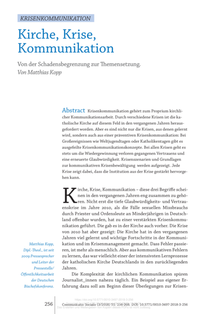 "Krisenkommunikation gehört zum Proprium kirchlicher Kommunikationsarbeit. Durch verschiedene Krisen ist die katholische Kirche auf diesem Feld in den vergangenen Jahren herausgefordert worden. Aber es sind nicht nur die Krisen, aus denen gelernt wird, sondern auch aus einer präventiven Krisenkommunikation: Bei Großereignissen wie Weltjugendtagen oder Katholikentagen gibt es ausgefeilte Krisenkommunikationskonzepte. Bei allen Krisen geht es stets um die Wiedergewinnung verloren gegangenen Vertrauens und eine erneuerte Glaubwürdigkeit. Krisenszenarien und Grundlagen zur kommunikativen Krisenbewältigung werden aufgezeigt. Jede Krise zeigt dabei, dass die Institution aus der Krise gestärkt hervorgehen kann." (Abstract)