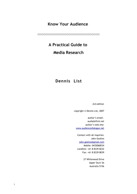 Other editions: 1st ed.: Radio survey cookbook: basic audience survey for radio stations. Adelaide: Australian Broadcasting Corporation (ABC), 1991; 2nd ed. (minor revisions): Know your audience: a practical guide to media research. Wellington (NZ): Original Books, 2005