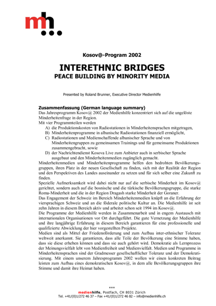 Kosov@-Program 2002: Interethnic Bridges. Peacebuilding by Minority Media