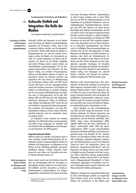 "Viele Sender haben 2007 Integration auf ihre Fahnen geschrieben. Das ZDF hat beispielsweise mit einer Integrations-Programmwoche im Herbst vergangenen Jahres, mit öffentlichkeitswirksamen Maßnahmen wie der Wahl der Journalistin Dunja Hayali für das „heute-journal“ sowie durch eine Kooperation mit einem türkischen Fernsehsender versucht, sich deutlich als Integrationssender zu positionieren. Auffallend ist außerdem, dass seit dem vergangenen Jahr die Zahl der Veranstaltungen zum Thema Medien und Integration erkennbar zugenommen hat – von Berlin bis Karlsruhe, von Nürnberg bis Frankfurt betätigen sich Verbände, Stiftungen und Medieninitiativen auf diesem Feld in einem bisher unbekannten Maß. Die Bedeutung des Themas ist also erkannt. Die Gefahr besteht dabei aber, dass man immer wieder die Bedeutung der Aufgabe betont, ohne einen wesentlichen Schritt bei der Umsetzung weiter zu kommen. Wichtig ist, dass die Medienanbieter Strukturen, strategische Ziele und Umsetzungsinstrumente im Bereich Integration entwickeln. Der WDR hat diesen Weg eingeschlagen. Durch einen Integrationsbericht, der vom Integrationsbeauftragten jährlich den Gremien präsentiert wird, werden seit 2004 Fortschritte und Entwicklungen des Unternehmens in diesem Bereich systematisch und nachhaltig erfasst. Es geht heute mehr den je darum, die programmpolitische Diskussion weiter zu vertiefen und zu konkretisieren. In diesem Zusammenhang ist es sehr zu begrüßen, dass die CIVIS medien stiftung in Kooperation mit dem WDR und der Deutschen Welle im September 2008 eine Programmkonferenz zum Thema „Integration“ bei der Deutschen Welle in Bonn veranstalten wird. Dort soll anhand von Programmbeispielen über innovative Ansätze im fiktionalen und nonfiktionalen Bereich diskutiert werden." (Fazit, Seite 123-124)