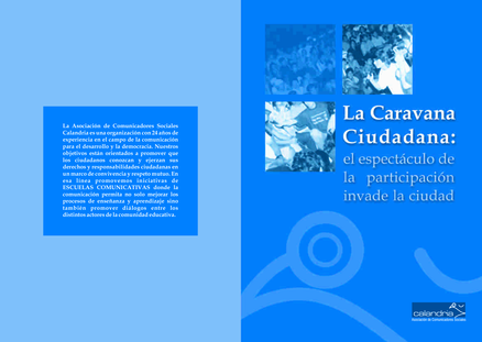 "La Caravana Ciudadana es una propuesta metodológica de comunicación que busca incentivar el aprendizaje y la experiencia de participación de la ciudadanía. Es un espectáculo de participación itinerante que aprovecha los espacios de encuentro y comunicación como plazas, calles, mercados, patios de escuelas, para organizar un conjunto de actividades interactivas e innovadoras que los transformen en espacios de acceso a información de calidad, de promoción de la expresión y el debate públicos, de fortalecimiento de la autoestima; con la perspectiva de desarrollar opiniones y propuestas ciudadanas que se transformen en insumos para la incidencia sobre las autoridades de la localidad. La Caravana Ciudadana puede ser un recurso útil para que docentes y estudiantes movilicen la opinión de la comunidad educativa en torno a temas que consideran claves y para ello pueden usar los escenarios del interior de la escuela o tomar los espacios públicos de su localidad." (Página 1)