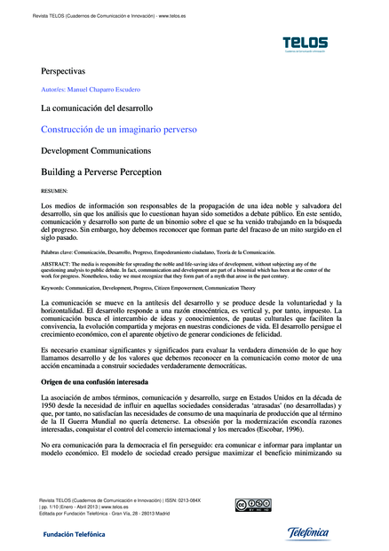 "Los medios de información son responsables de la propagación de una idea noble y salvadora del desarrollo, sin que los análisis que lo cuestionan hayan sido sometidos a debate público. En este sentido, comunicación y desarrollo son parte de un binomio sobre el que se ha venido trabajando en la búsqueda del progreso. Sin embargo, hoy debemos reconocer que forman parte del fracaso de un mito surgido en el siglo pasado." (Resumen)