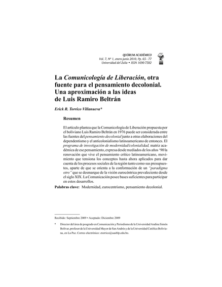 "El artículo plantea que la Comunicología de Liberación propuesta por el boliviano Luis Ramiro Beltrán en 1976 puede ser considerada entre las fuentes del pensamiento decolonial junto a otras elaboraciones del dependentismo y el anticolonialismo latinoamericano de entonces. El programa de investigación de modernidad/colonialidad, matriz académica de ese pensamiento, expresa desde mediados de los años ‘90 la renovación que vive el pensamiento crítico latinoamericano, movimiento que tensiona los conceptos hasta ahora aplicados para dar cuenta de los procesos sociales de la región tanto como sus presupuestos, aparte de que se orienta a la conformación de un “paradigma otro” que se desmarque de la visión eurocéntrica prevaleciente desde el siglo XIX. La Comunicación posee bases suficientes para participar en estos desarrollos." (Resumen)