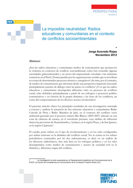 "El presente artículo ofrece los principales resultados de una investigación orientada a conocer y analizar la actuación de dos emisoras educativas y comunitarias: Radio Cutivalú de Piura y Radio Marañón de Jaén, en el contexto del conflicto socioambiental generado por el proyecto minero Río Blanco (2005-2007) ubicado en una zona de cabecera de cuenca, en el nororiente peruano, cuyo ámbito de influencia abarca las provincias de Huancabamba y Ayabaca, en la región Piura, y de San Ignacio, en la región Cajamarca. El estudio pone énfasis en el tipo de involucramiento y en los roles configurados por ambas emisoras en la dinámica del conflicto social. No se centra en los relatos periodísticos construidos por las dos radioemisoras, es decir en un análisis de los discursos radiofónicos, sino más bien en los enfoques políticos y en los roles desempeñados como medios de comunicación y actores de sociedad civil en la dinámica y diferentes etapas del conflicto." (Resumen)