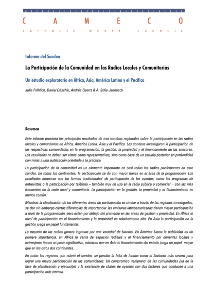 "Este informe presenta los principales resultados de tres sondeos regionales sobre la participación en las radios locales y comunitarias en África, América Latina, Asia y el Pacífico. Los sondeos investigaron la participación de las respectivas comunidades en la programación, la gestión, la propiedad y el financiamiento de las emisoras. La participación de la comunidad es un elemento importante en casi todas las radios participantes en este sondeo. En todos los continentes, la participación se da con mayor fuerza en el área de la programación. Los resultados muestran que las formas 'tradicionales' de participación de los oyentes, como los programas de entrevistas o la participación por teléfono – también muy de uso en la radio pública o comercial - son las más frecuentes en la radio local y comunitaria. La participación en la gestión, la propiedad y el financiamiento es menos común. Mientras la clasificación de las diferentes áreas de participación es similar a través de las regiones investigadas, se dan sin embargo ciertas diferencias de importancia: las emisoras latinoamericanas tienen mayor participación a nivel de la programación, pero están por debajo del promedio en las áreas de gestión y propiedad. En África el nivel de participación en el financiamiento y la propiedad es relativamente alto. En Asia la participación en la gestión juega un papel fundamental. La mayoría de las radios genera ingresos por una variedad de fuentes. En América Latina la publicidad es de primera importancia, en África la venta de espacios radiales y el financiamiento por donantes locales y extranjeros tienen un peso significativo, mientras que en Asia el financiamiento del estado juega un papel mayor que en los otros dos continentes. En todas las regiones que cubrió el sondeo, se percibe la falta de fondos como el limitante más severo para lograr una mayor participación de las comunidades. Un compromiso 'temprano' de las comunidades (ya en la fase de planificación y ejecución) y la existencia de clubes de oyentes son dos factores que conducen a una participación más intensa." (Resumen)