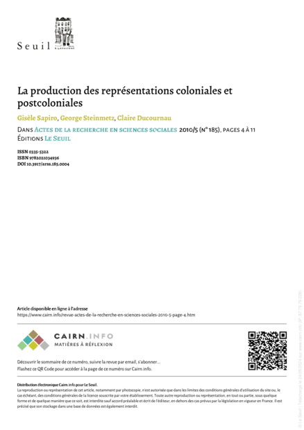 "Entreprise de domination par excellence, la colonisation s’est accompagnée et nourrie de représentations savantes, littéraires et artistiques, des sociétés colonisées, qui ont servi à la légitimer, au nom d’une prétendue mission civilisatrice de l’Occident, ou encore d’une soi-disant hiérarchie des « races » et des cultures. Relayées par la presse notamment, elles ont connu une large diffusion par le biais de récits d’aventure et d’une imagerie populaire qui excitaient les sentiments patriotiques et les rêves de grandeur dans le cadre de la compétition entre les États-nations tout en exaltant l’imaginaire mythique et en suscitant des émotions aptes à satisfaire le goût d’exotisme en vogue dans les milieux mondains. C’est pourquoi la critique et la déconstruction de ces représentations furent des enjeux symboliques majeurs du combat anticolonial et antiraciste. Pour des auteurs comme W. E. Du Bois, Albert Memmi, Michel Leiris ou Frantz Fanon, il s’agissait également de porter au jour le point de vue des colonisés, qui n’était perçu jusque-là que comme un groupe-objet, de restituer leur subjectivité (ce qu’on appelle en anglais « agency »), tandis qu’un Aimé Césaire, porte-parole du mouvement de la « négritude », qui retournait le stigmate en emblème, opposait aux soi-disant bienfaits de la colonisation pour les colonisés la déshumanisation des colonisateurs par leur entreprise. La période postcoloniale a ouvert un espace de réflexion plus distanciée pour penser les rapports de domination en situation coloniale. Ces représentations sont devenues un objet d’étude dans les sciences humaines et, plus récemment, dans les sciences sociales." (Introduction)