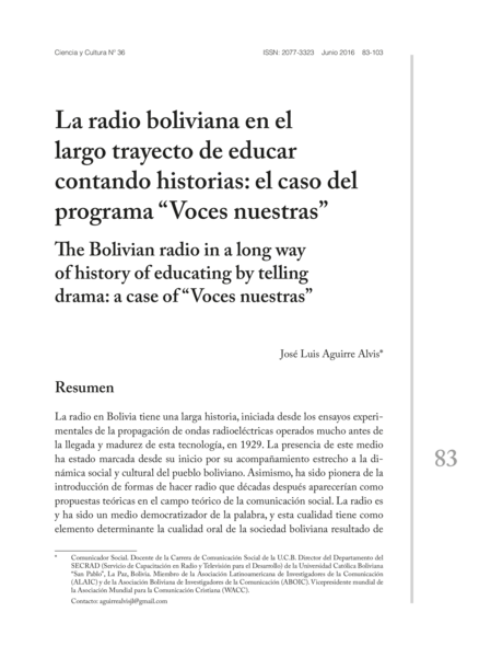 "La radio en Bolivia tiene una larga historia, iniciada desde los ensayos experimentales de la propagación de ondas radioeléctricas operados mucho antes de la llegada y madurez de esta tecnología, en 1929. La presencia de este medio ha estado marcada desde su inicio por su acompañamiento estrecho a la dinámica social y cultural del pueblo boliviano. Asimismo, ha sido pionera de la introducción de formas de hacer radio que décadas después aparecerían como propuestas teóricas en el campo teórico de la comunicación social. La radio es y ha sido un medio democratizador de la palabra, y esta cualidad tiene como elemento determinante la cualidad oral de la sociedad boliviana resultado de su carácter indígena-originario. La metodología de la educación por entretenimiento se propone mundialmente como un recurso para generar procesos de cambio social, y dentro de ella se ejecuta en Bolivia el Programa "Voces nuestras", que reaviva la experiencia de contar historias para cambiar vidas." (Resumen)