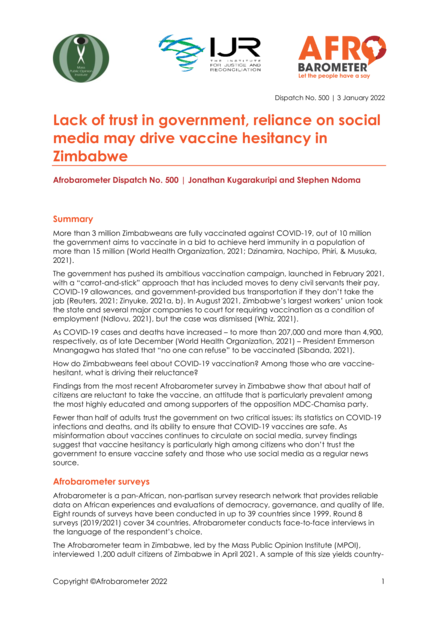 "Findings from the most recent Afrobarometer survey in Zimbabwe show that about half of citizens are reluctant to take the vaccine, an attitude that is particularly prevalent among the most highly educated and among supporters of the opposition MDC-Chamisa party. Fewer than half of adults trust the government on two critical issues: its statistics on COVID-19 infections and deaths, and its ability to ensure that COVID-19 vaccines are safe. As misinformation about vaccines continues to circulate on social media, survey findings suggest that vaccine hesitancy is particularly high among citizens who don’t trust the government to ensure vaccine safety and those who use social media as a regular news source." (Summary)