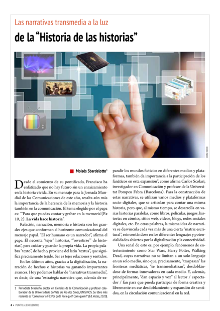 "Desde el comienzo de su pontificado, Francisco ha enfatizado que no hay futuro sin un enraizamiento en la historia vivida. En su mensaje para la Jornada Mundial de las Comunicaciones de este año, resalta aún más la importancia de la herencia de la memoria y la historia también en la comunicación. El tema elegido por el papa es: “‘Para que puedas contar y grabar en la memoria’ (Ex 10, 2). La vida hace historia”. Relación, narración, memoria e historia son los grandes ejes que conforman el horizonte comunicacional del mensaje papal. “El ser humano es un narrador”, afirma el papa. Él necesita “tejer” historias, “’revestirse’” de historias”, para cuidar y guardar la propia vida. La propia palabra “texto”, de hecho, proviene del latín “textus”, que significa precisamente tejido. Ser es tejer relaciones y sentidos. En los últimos años, gracias a la digitalización, la narración de hechos e historias va ganando importantes avances. Hoy podemos hablar de “narrativas transmedia”, es decir, de una “estrategia narrativa que, además de exandir los mundos ficticios en diferentes medios y plataformas, también da importancia a la participación de los fanáticos en esta expansión”, como afirma Carlos Scolari, investigador en Comunicación y profesor de la Universitat Pompeu Fabra (Barcelona). Para la construcción de estas narrativas, se utilizan varios medios y plataformas socio-digitales, que se articulan para contar una misma historia, pero que, al mismo tiempo, se desarrolla en varias historias paralelas, como libros, películas, juegos, historias en cómics, sitios web, videos, blogs, redes sociales digitales, etc. En otras palabras, la misma idea de narrativa se desvincula cada vez más de una cierta “matriz escritural”, reinventándose en los diferentes lenguajes y potencialidades abiertos por la digitalización y la conectividad." (Página 4)
