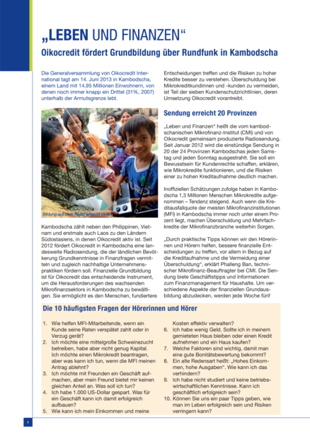 "Seit 2012 fördert Oikocredit in Kambodscha eine landesweite Radiosendung, die der ländlichen Bevölkerung Grundkenntnisse in Finanzfragen vermitteln und zugleich nachhaltige Unternehmenspraktiken fördern soll. Finanzielle Grundbildung ist für Oikocredit das entscheidende Instrument, um die Herausforderungen des wachsenden Mikrofinanzsektors in Kambodscha zu bewältigen. Sie ermöglicht es den Menschen, fundiertere Entscheidungen treffen und die Risiken zu hoher Kredite besser zu verstehen. Überschuldung bei Mikrokreditkundinnen und -kunden zu vermeiden, ist Teil der sieben Kundenschutzrichtlinien, deren Umsetzung Oikocredit vorantreibt." (Seite 8)